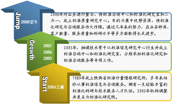标准质量研究中心陕西省标准化研究院标准质量研究中心,是我省专业从事标准化研究与技术服务的公益性权威机构。主要开展标准化与质量相关的课题研究、横向项目协作。我中心主要致力于标准化基础与应用、现代服务业标准化等领域方向的课题研究,近几年承担了国家科技部、省科技厅、国家质检总局等下达的国家和部门级标准化研究课题二十余项,为当地国民经济和社会发展提供了有力的技术支撑。 同时,我中心一贯秉承“与客户共同发展”的工作理念,依托现有研究成果、丰富的标准资源和专业的标准化人才队伍,面向企事业单位提供标准化技术与管理咨询服务。目前,我中心已为多家企业提供企业标准体系建设咨询,并指导其顺利通过“企业标准化良好行为(GSP)”认证。近几年,与相关行业部门共同起草我省地方标准数十项,为机械、化工、石油、食品等多种行业企业制修定企业产品标准400余项。 机构发展与沿革情况如下所示: