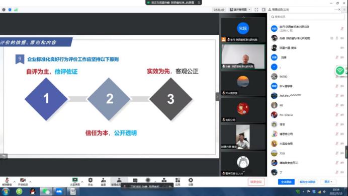 为认真贯彻落实《国家标准化发展纲要》《2022年全国标准化工作要点》《2022年陕西市场监管标准化管理工作要点》等文件精神,切实提升企业标准化水平,7月15日,我院举办了企业标准“领跑者”暨企业标准化良好行为评价线上公益培训会。省局标准化处相关人员到会指导,各地市市场监督管理部门、企事业单位等两百余人参加培训。