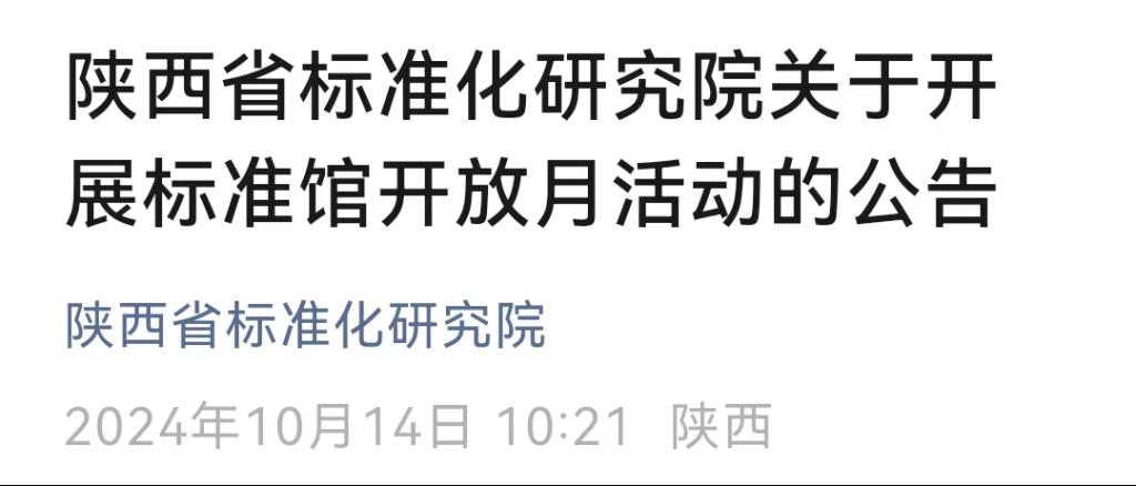 充分利用国家标准馆陕西分馆丰富的标准信息资源和重要影响力,积极向社会开放,并于2024年10月开展国家标准馆陕西分馆公众开放月活动,对企事业单位、高校、中小学生、市民等社会各界人士进行开放,向参访人员介绍标准化知识,赠送标准化宣传资料,提供标准化咨询服务。