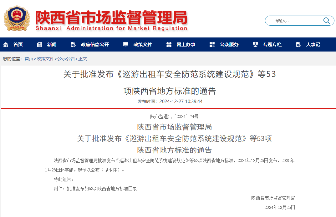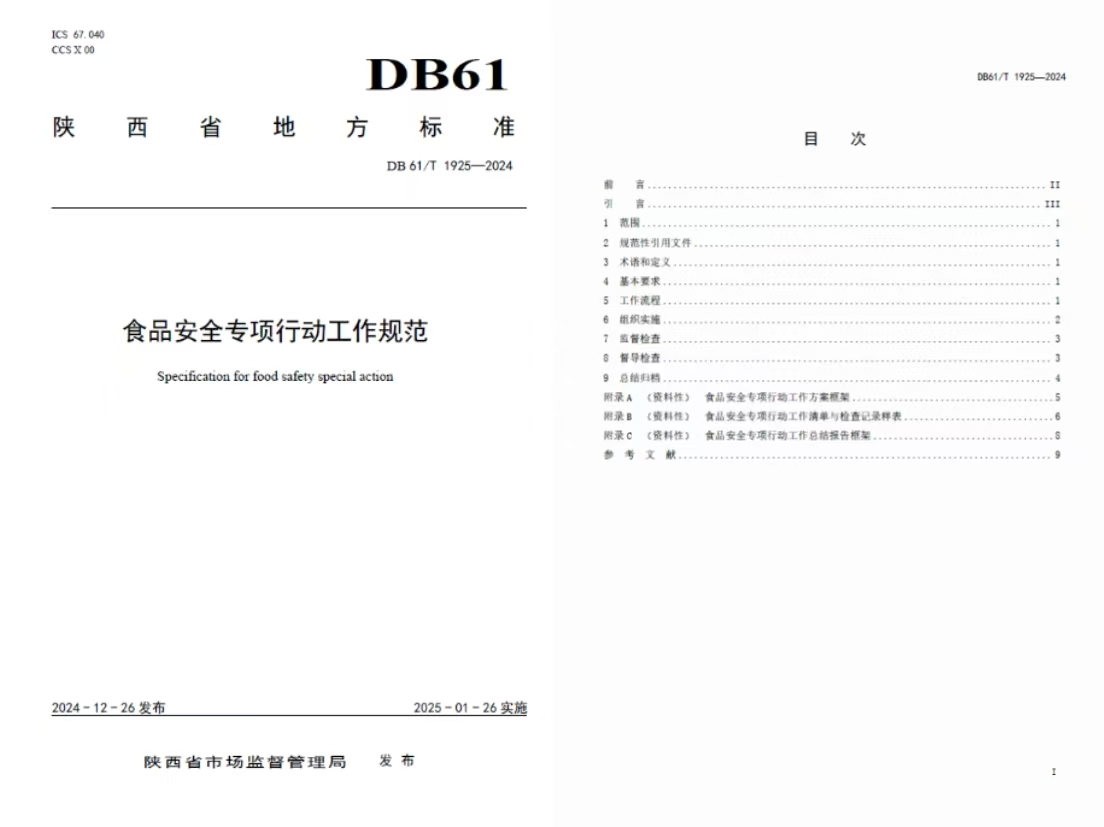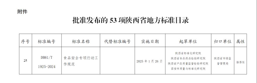 近日,我院牵头编写的陕西省地方标准《食品安全专项行动工作规范》,经省市场监督管理局组织审查,批准发布,编号为DB61/T 1925—2024,将于2025年1月26日起实施。