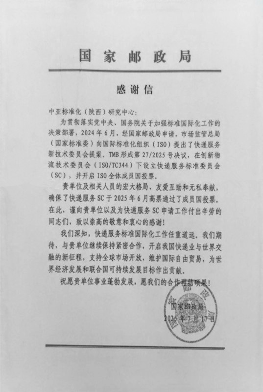 近日,我院喜获国家邮政局发来的感谢信,信中高度赞扬了中亚标准化(陕西)研究中心在推动国际化标准对接过程中所展现出的专业支持与卓越贡献,并表达了诚挚谢意。这一事件不仅有力印证了标准化工作在推动产业高质量发展中的关键作用,更充分彰显了陕西省标准化研究院在行业内的技术引领地位。