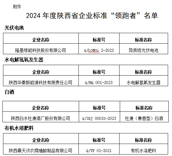 在企业申报、地市推荐的基础上,经技术审查、综合评估和网站公示,认定《异质结光伏电池》(Q/LONGi 2-2023)、《水电解氢氧发生器》(Q/HQ 001-2023)、《杜康(兼香型)白酒》(Q/SDJ 0003S-2023)、《有机水溶肥料》(Q/YF 01-2021)4项企业标准为2024年度陕西省企业标准“领跑者”,现予公告。